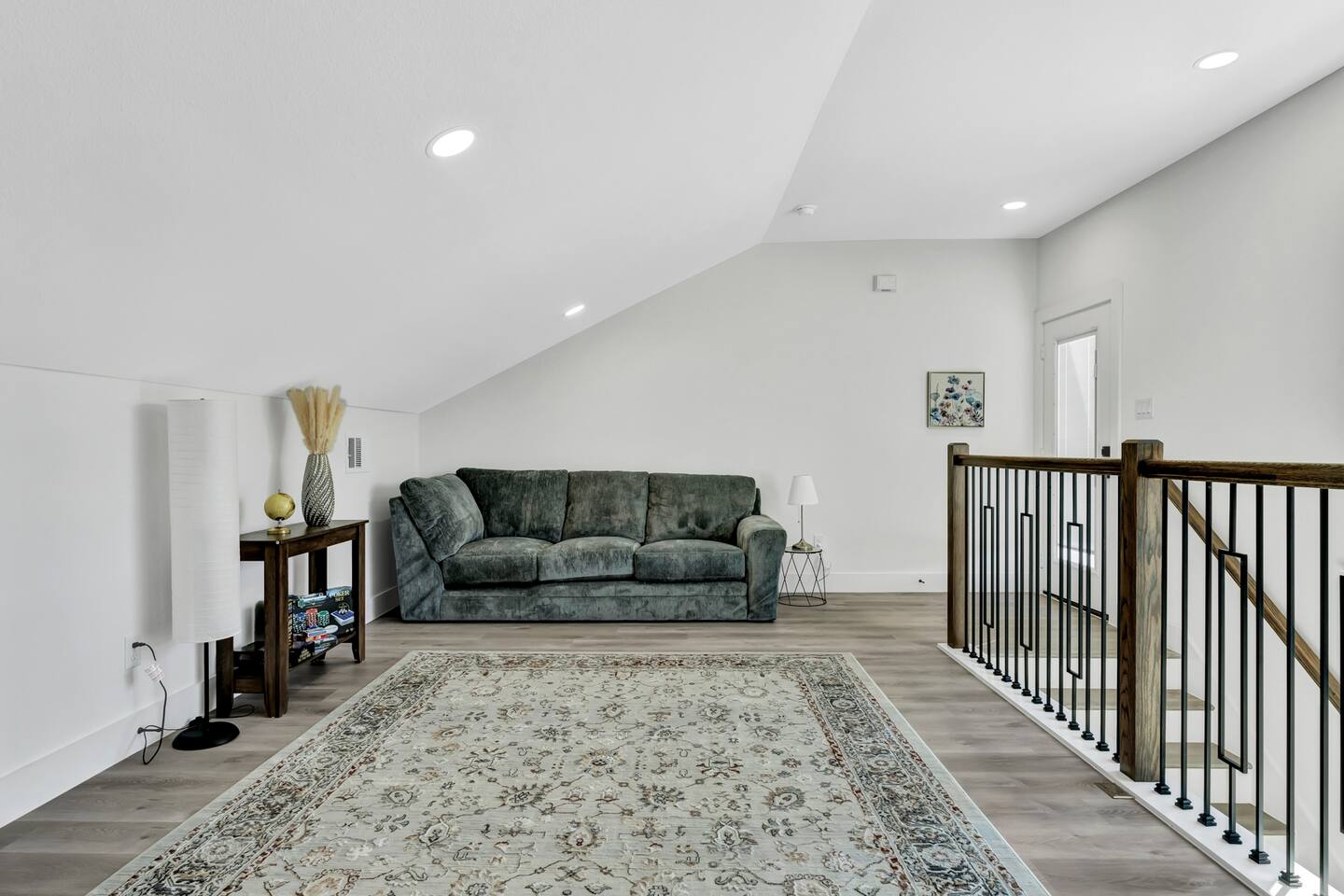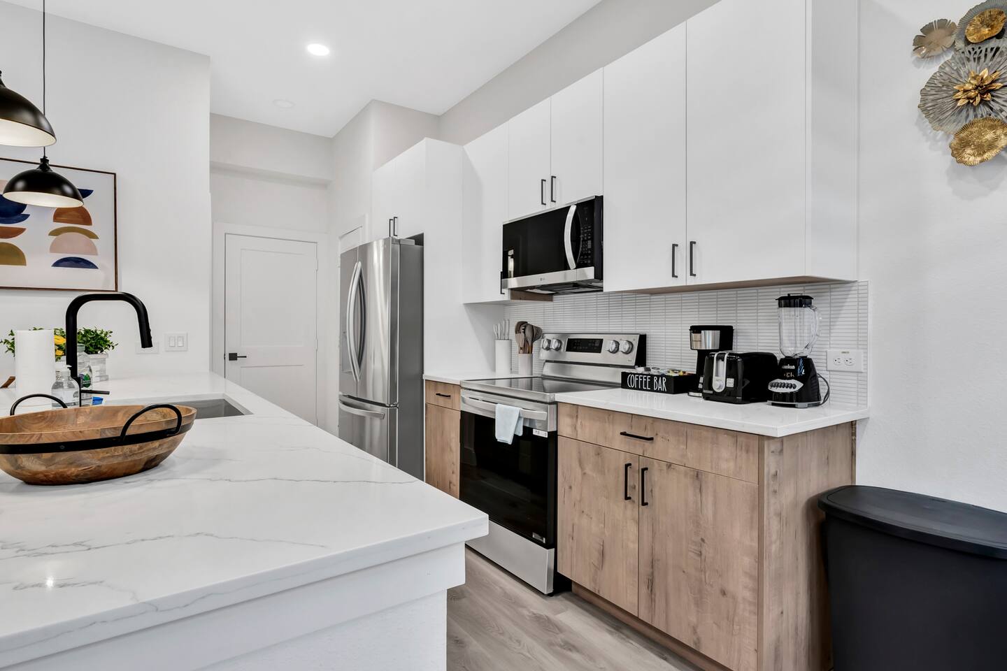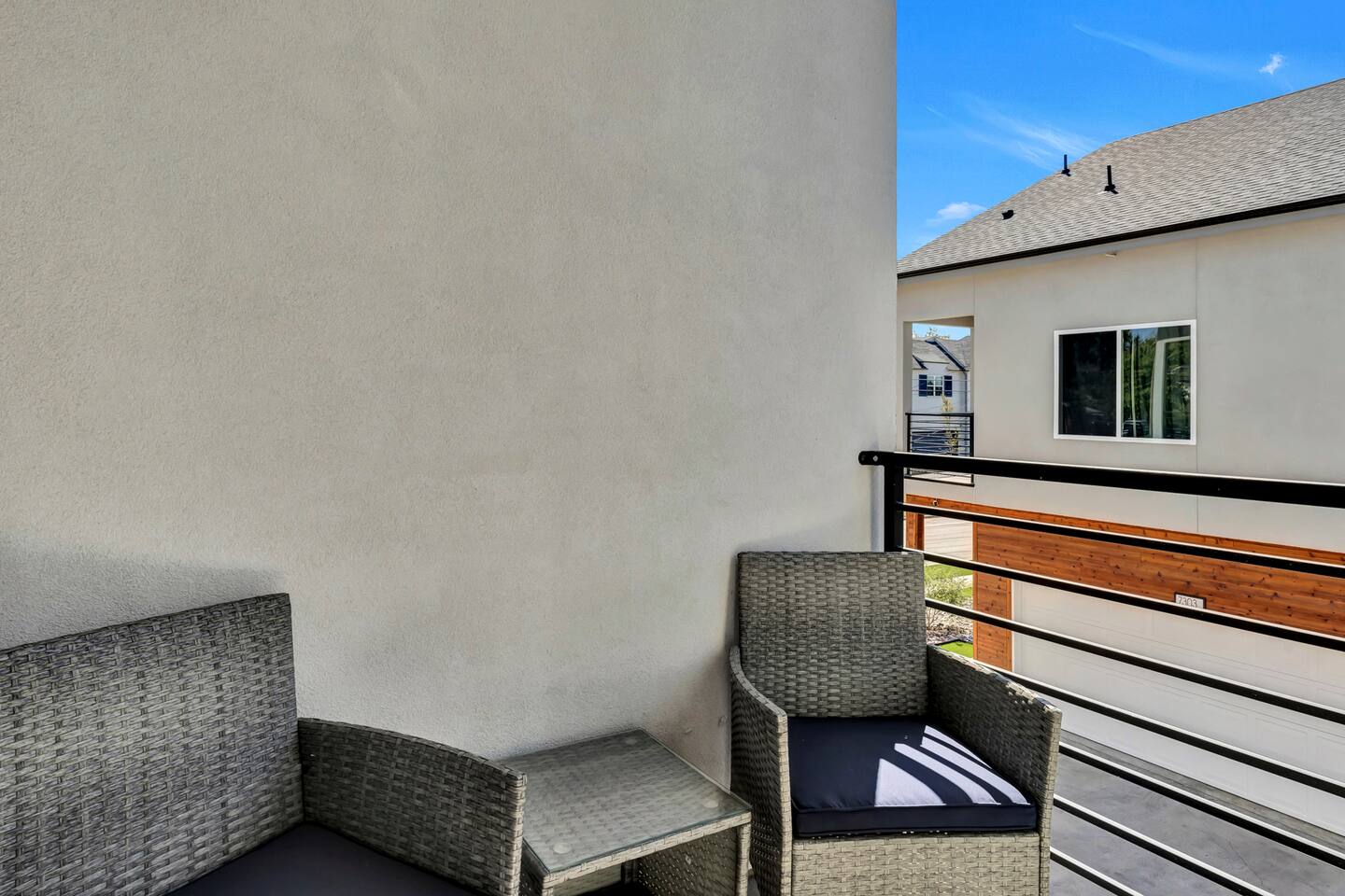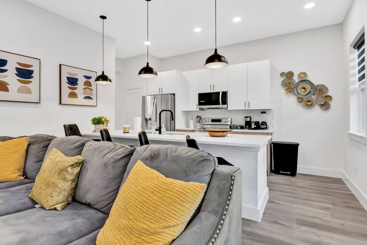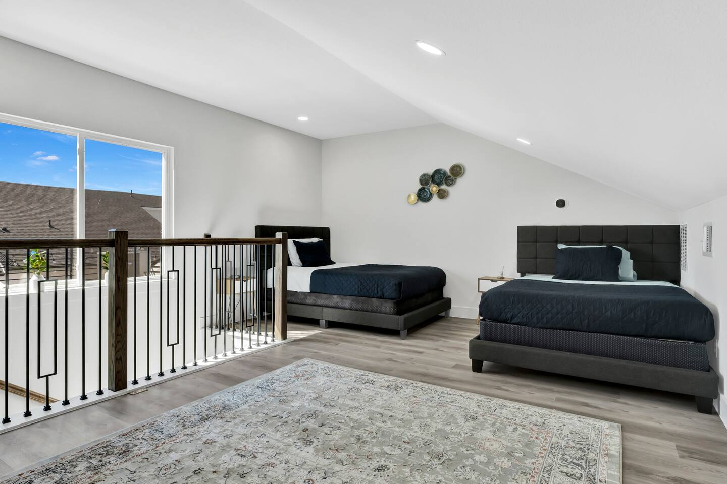 Guests have access to all three floors of the townhouse, including the living room, kitchen, bedrooms, playroom, and patio balcony. The garage is available for parking. Certain storage areas will remain locked and are not for guest use.
