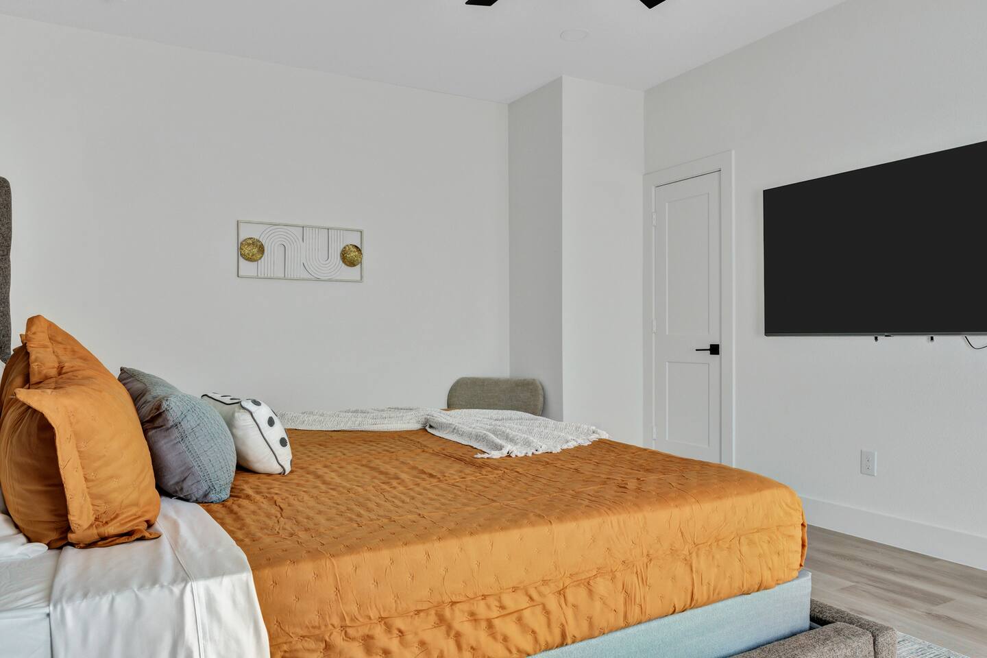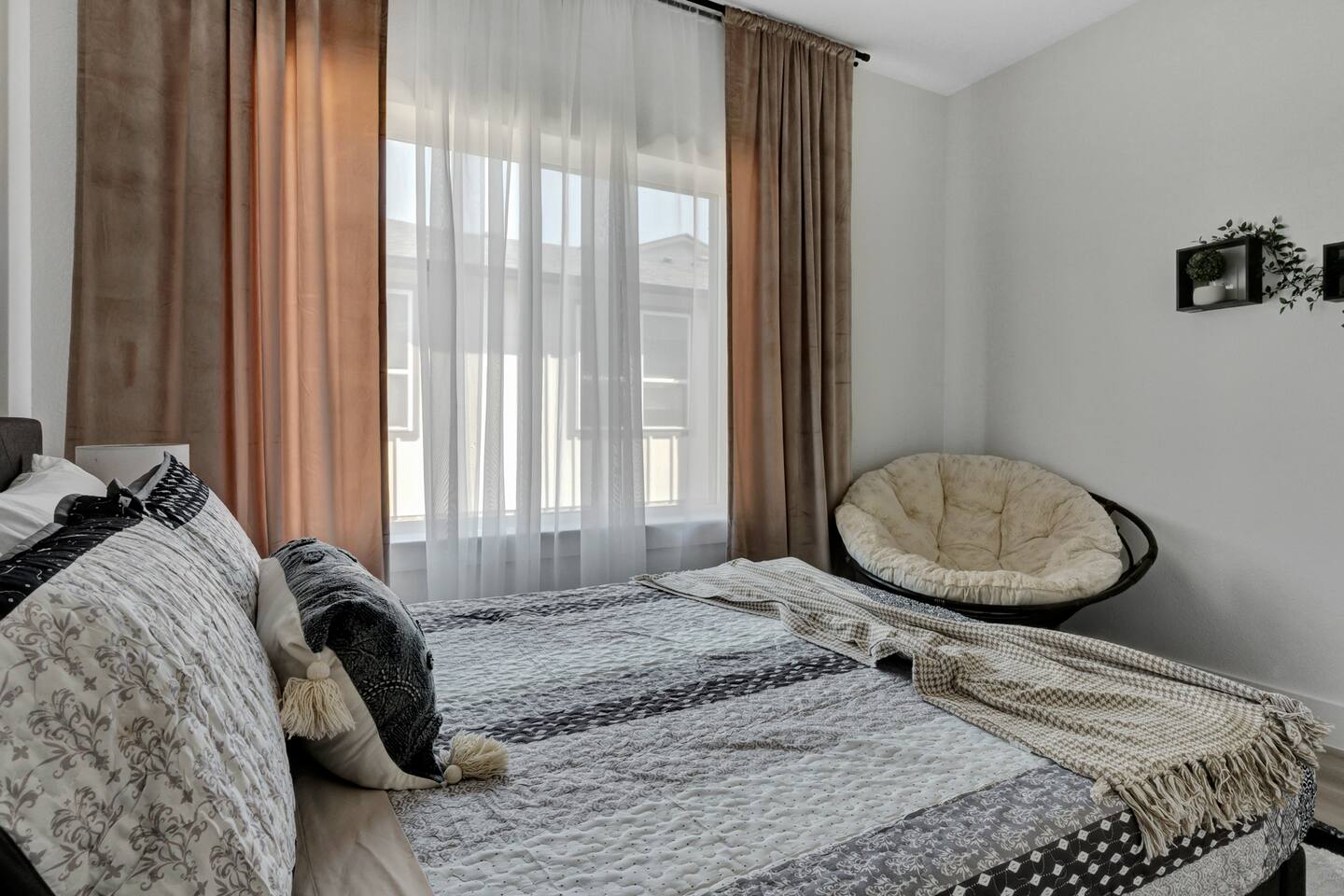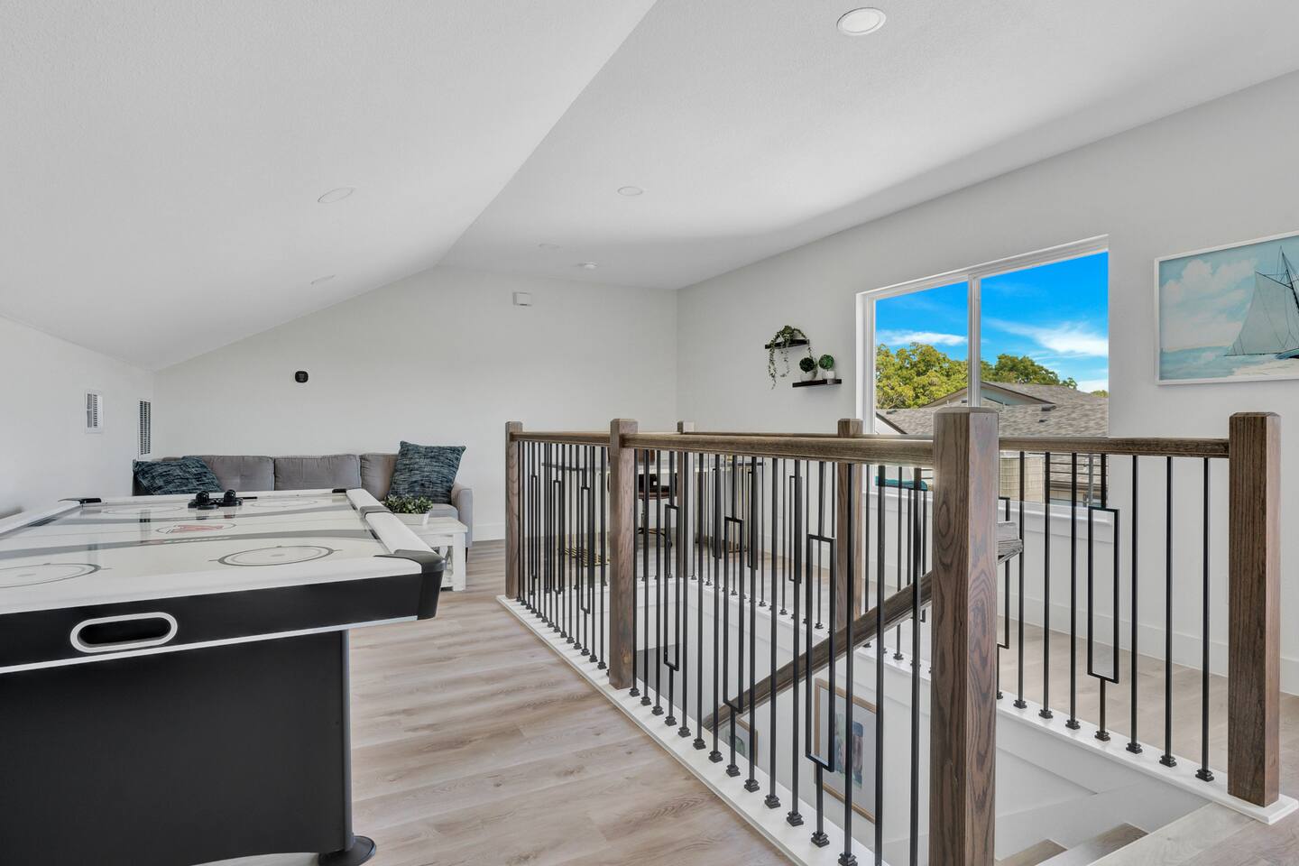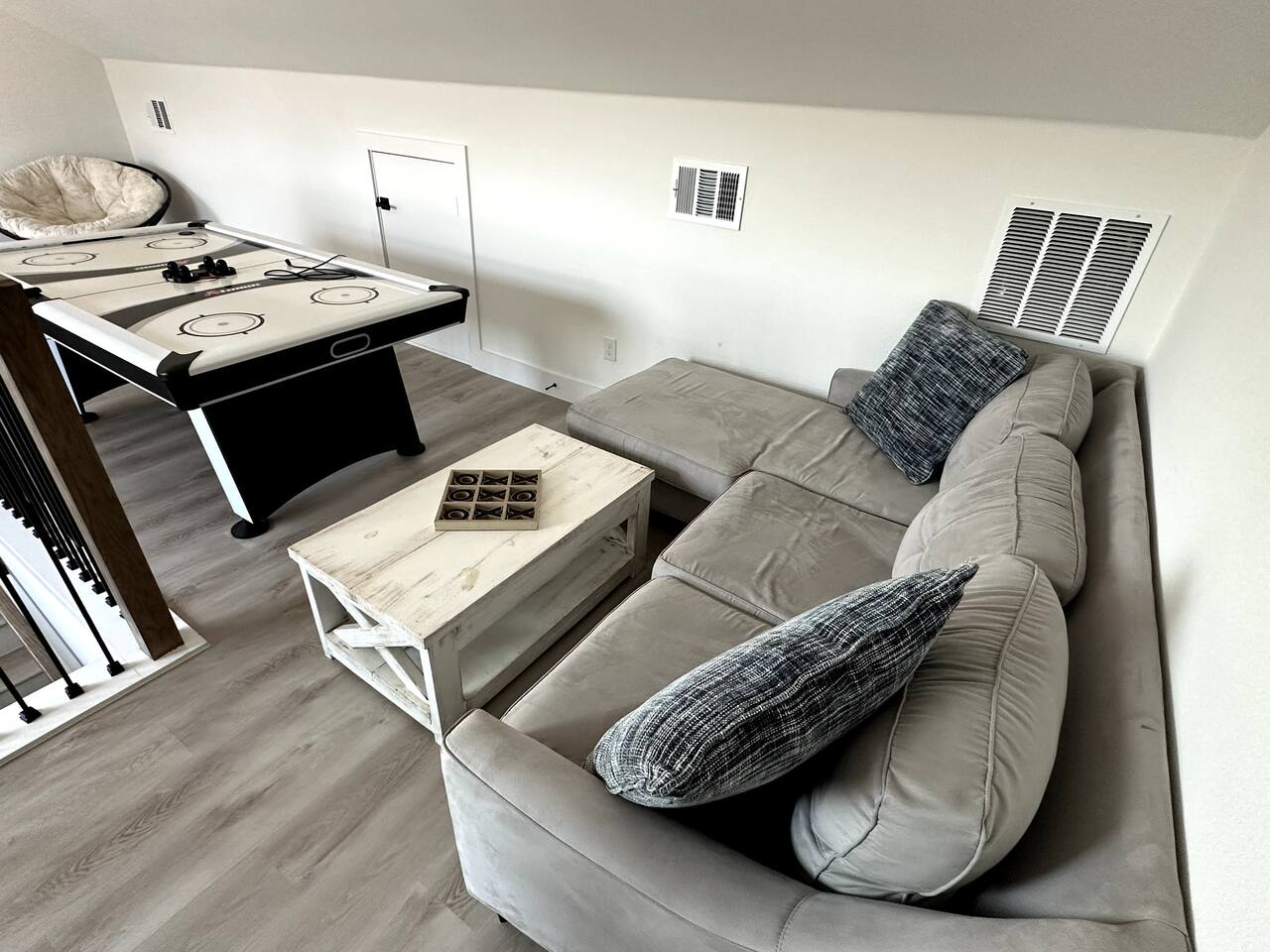 Guests have access to all three floors of the townhouse, including the living room, kitchen, bedrooms, playroom, and patio balcony. The garage is available for parking. Certain storage areas will remain locked and are not for guest use.